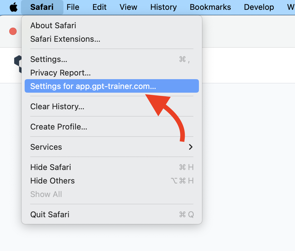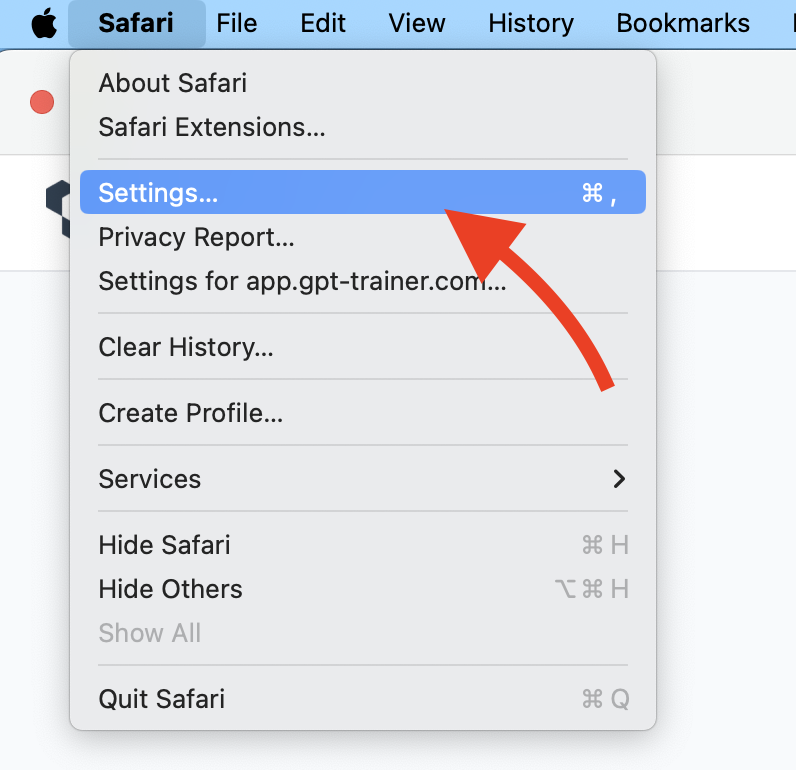 Click on “Safari” in the top-left corner of your screen, then select
