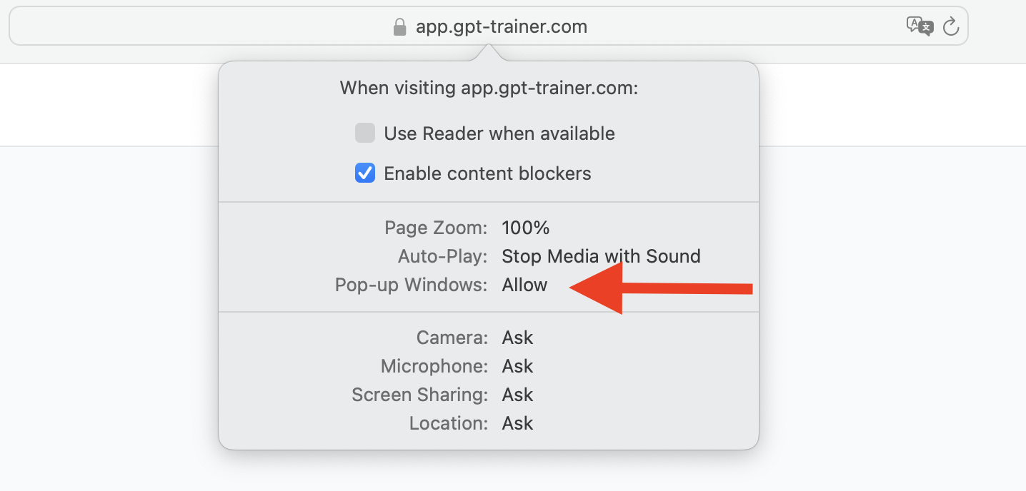 Make sure that “Pop-up Windows” are set to Allow.