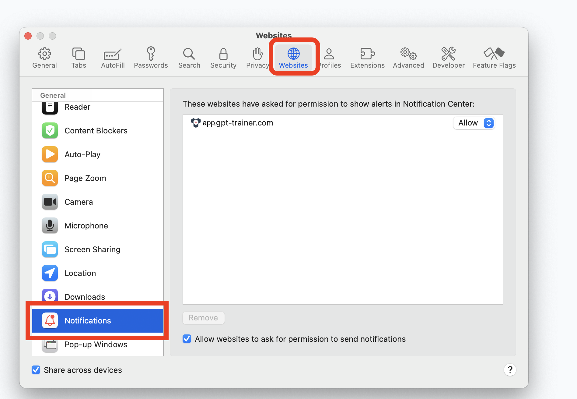 In the “Websites” tab, choose “Notifications” option and make sure that
