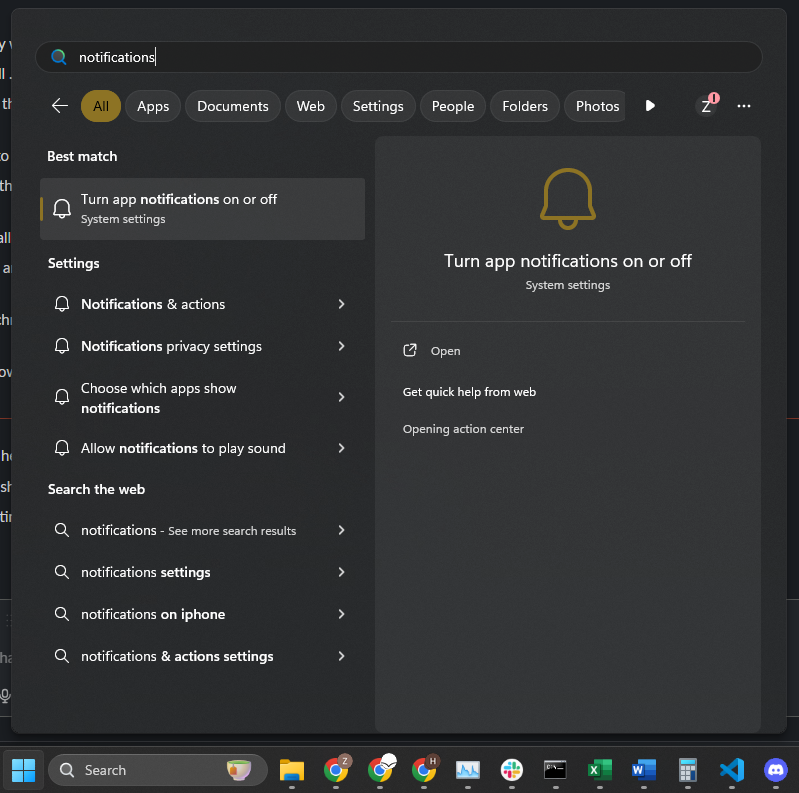 In the search bar, type “notifications” and select the “Turn app