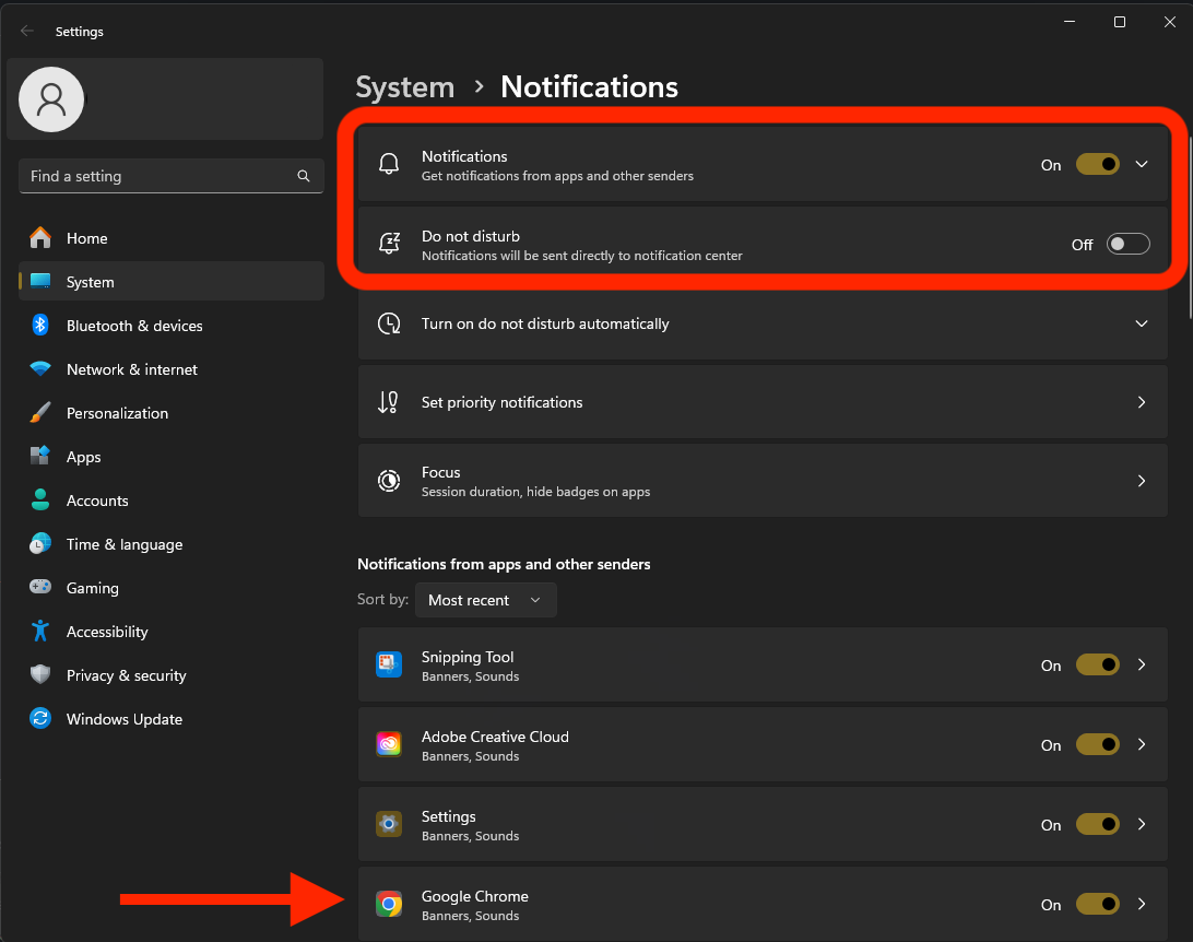 browser under “Notifications from apps and other senders” list.