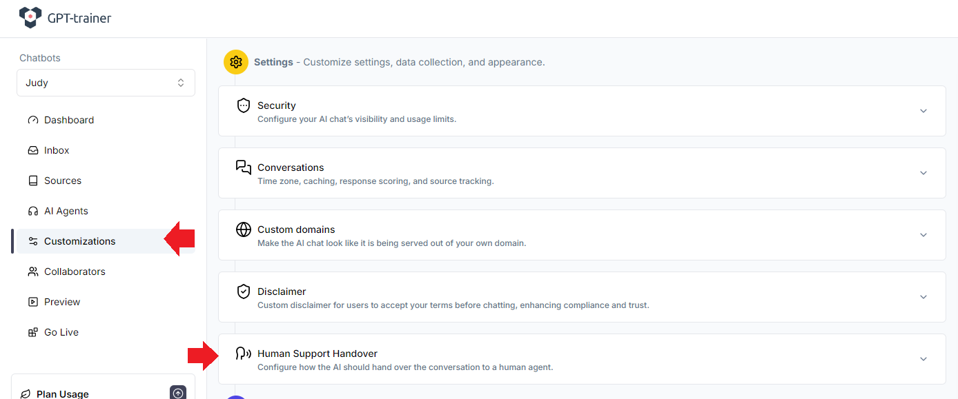 Go to Customizations tab. Under the “Settings” section, Click “Human Support Handover”.