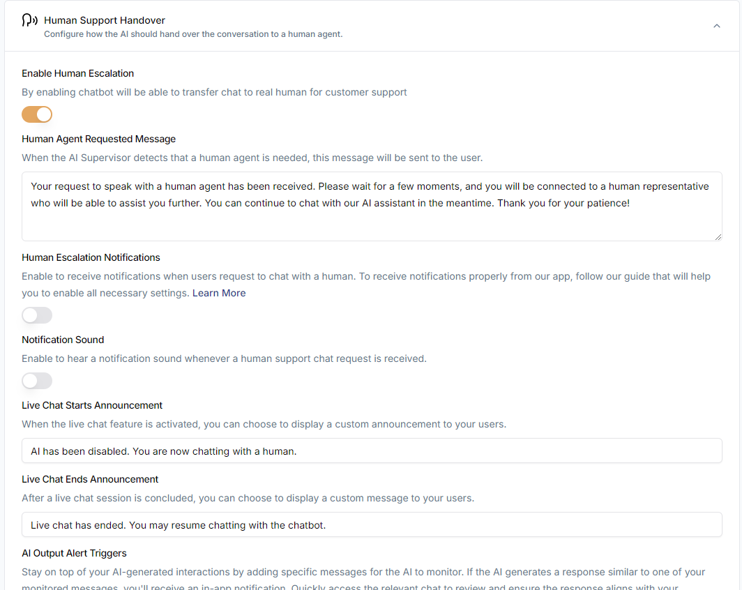 - Enable Human Escalation Notifications toggle - This ensures that notifications related to user support requests are activated.