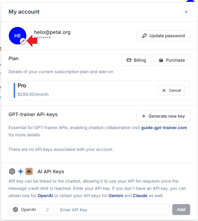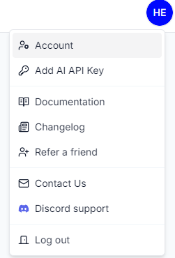 Each user account can have a single human avatar. This avatar shows up when that human agent takes over the chat session. Since innoChat supports multiple collaborators, many human agents can monitor the same chatbot and have their own avatars when responding to a user. To set up your own avatar, click the profile icon on the top right. You should see a dropdown menu: