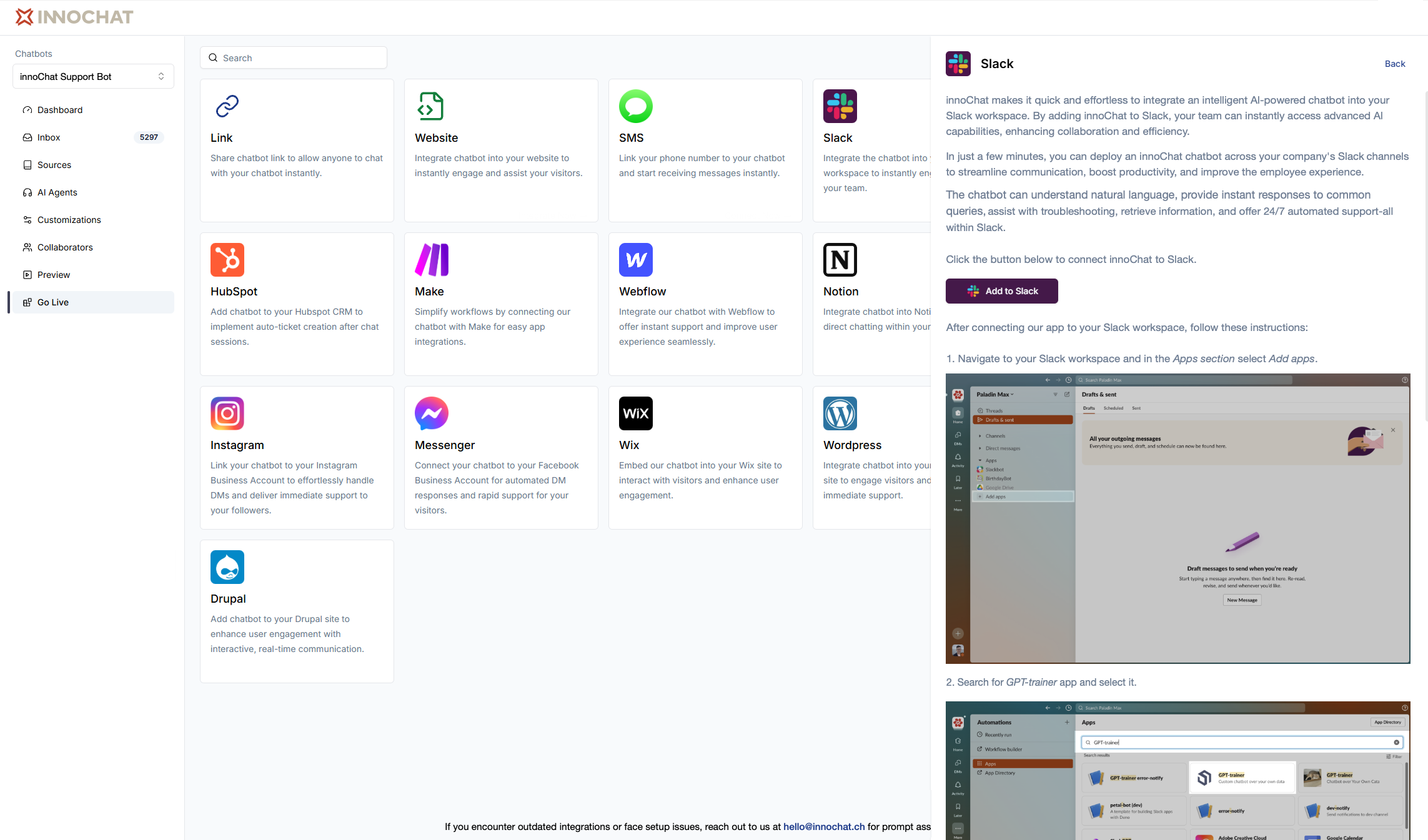 These steps assume you’ve already created an INNOCHAT account and have an INNOCHAT chatbot ready to use. If you haven’t, sign up for a free INNOCHAT account and create your first AI chatbot. For example, you could build a company FAQ chatbot to instantly answer common employee questions, a support bot to handle customer inquiries through chat, or a team collaboration bot to assist Slack teams by answering queries, summarizing conversations, and providing brainstorming suggestions. Get your chatbot tailored to your needs before proceeding with integration. If you don’t have a chatbot, you might want to explore creating one with INNOCHAT to get started.Find Slack Integration