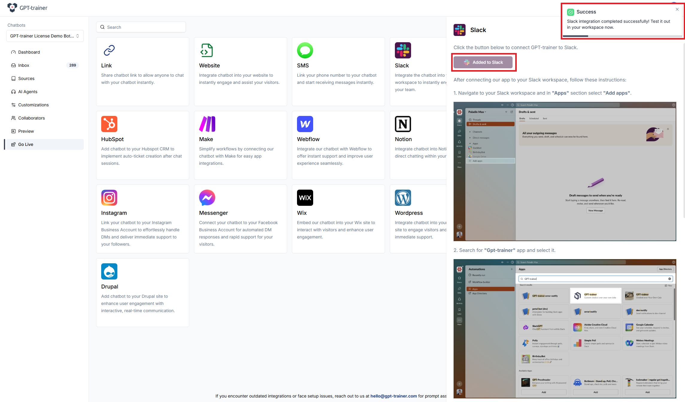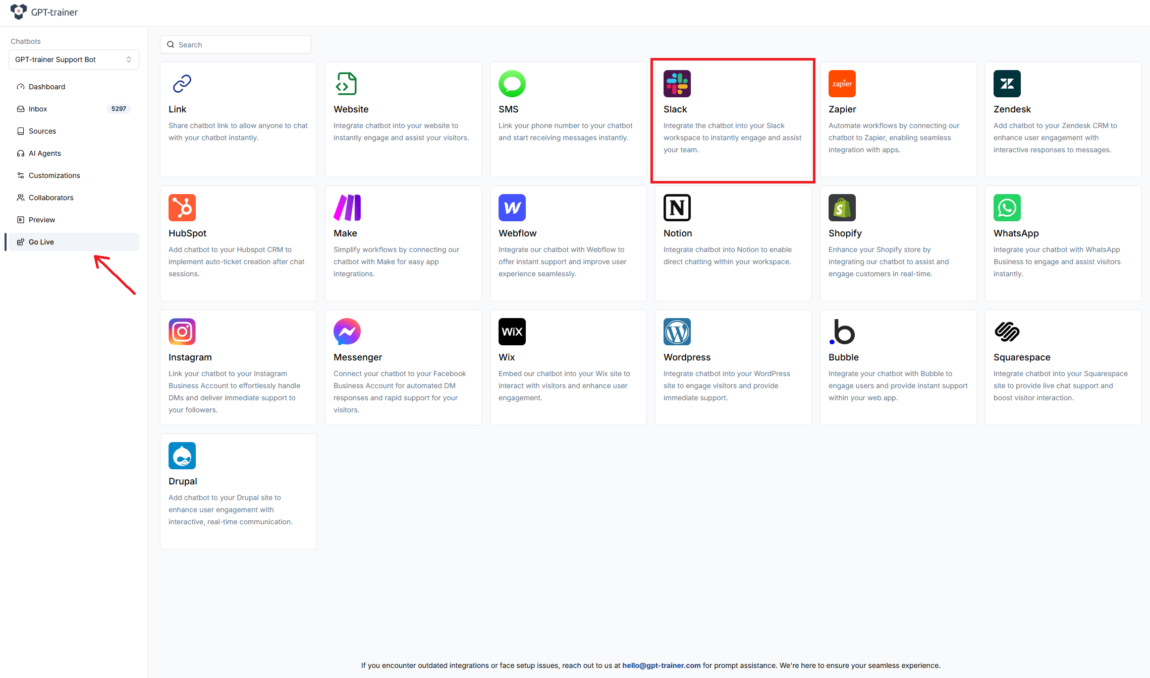 Once your chatbot is ready, select the one you want to integrate with Slack and proceed to the “Go Live” section. In this section, you’ll find the Slack integration option. Select it to move forward with the integration process.