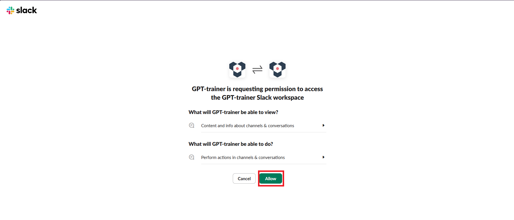 When you open the integration, you will see an “Add to Slack” button. Click on it to connect your Slack workspace to the chatbot.