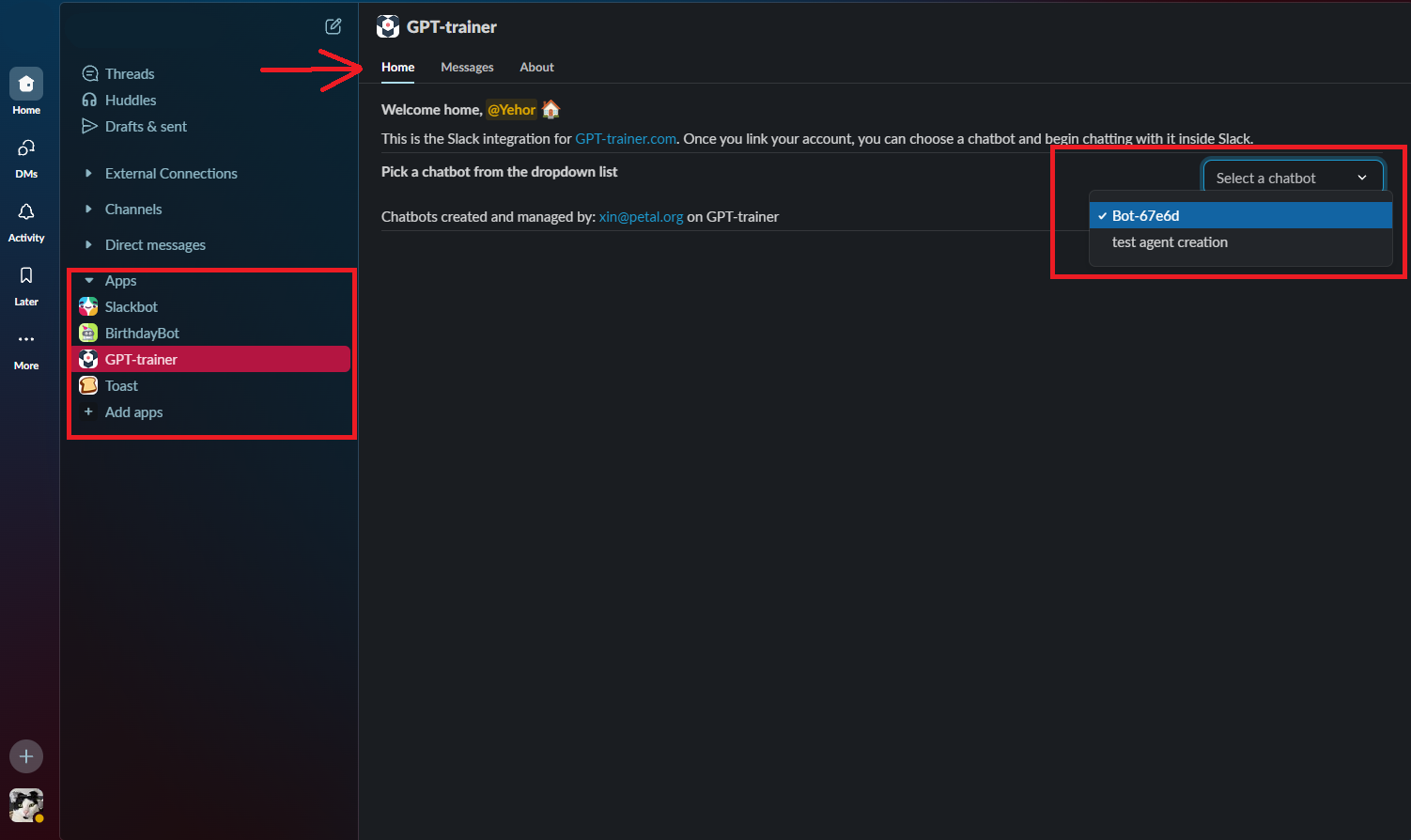 In your Slack workspace, under the “Apps” section, find the INNOCHAT app and click on it. In the “Home” section of the app, you will see a select field where you can choose the chatbot you want to chat with.